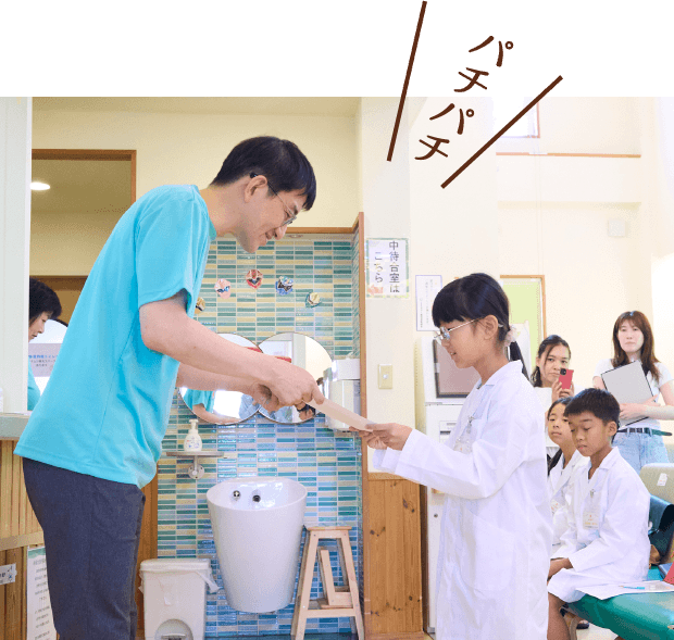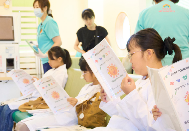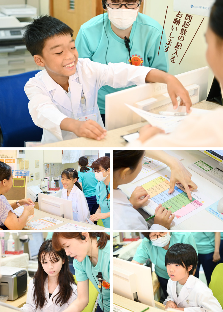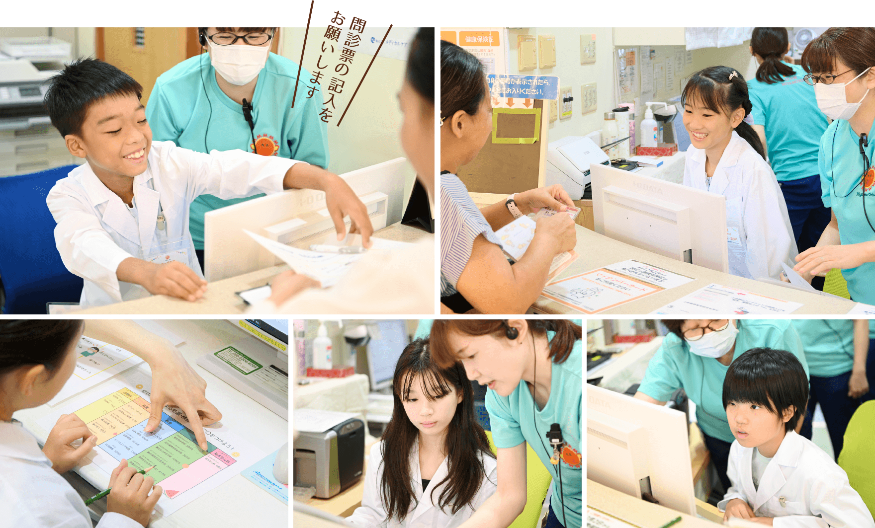 クリニックでのお仕事、各ブースに分かれて体験するよ!ブースを体験したらしおりにスタンプを押してもらおう。
